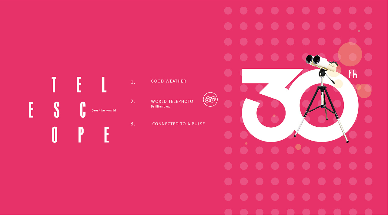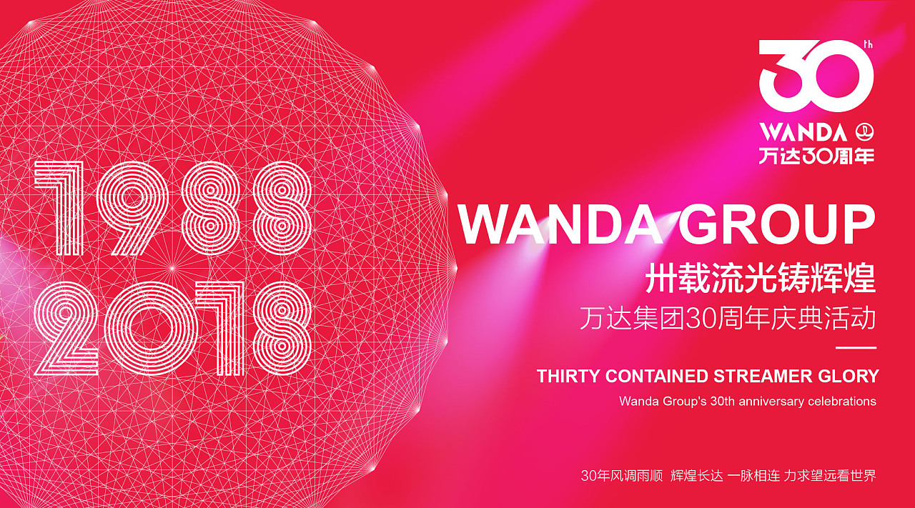 本次主kv顏色定為中國紅,寓意非凡、成就、慶祝;在數字30的字體設計上,我們和WANDA英文的形狀進行了完美統一,體現出氣勢感;同時也設計了名片、信封、雨傘等周邊,體現出分享和喜悅之情;“萬達集團30年風調雨順,輝煌長達,一脈相連,力求望遠世界。”
