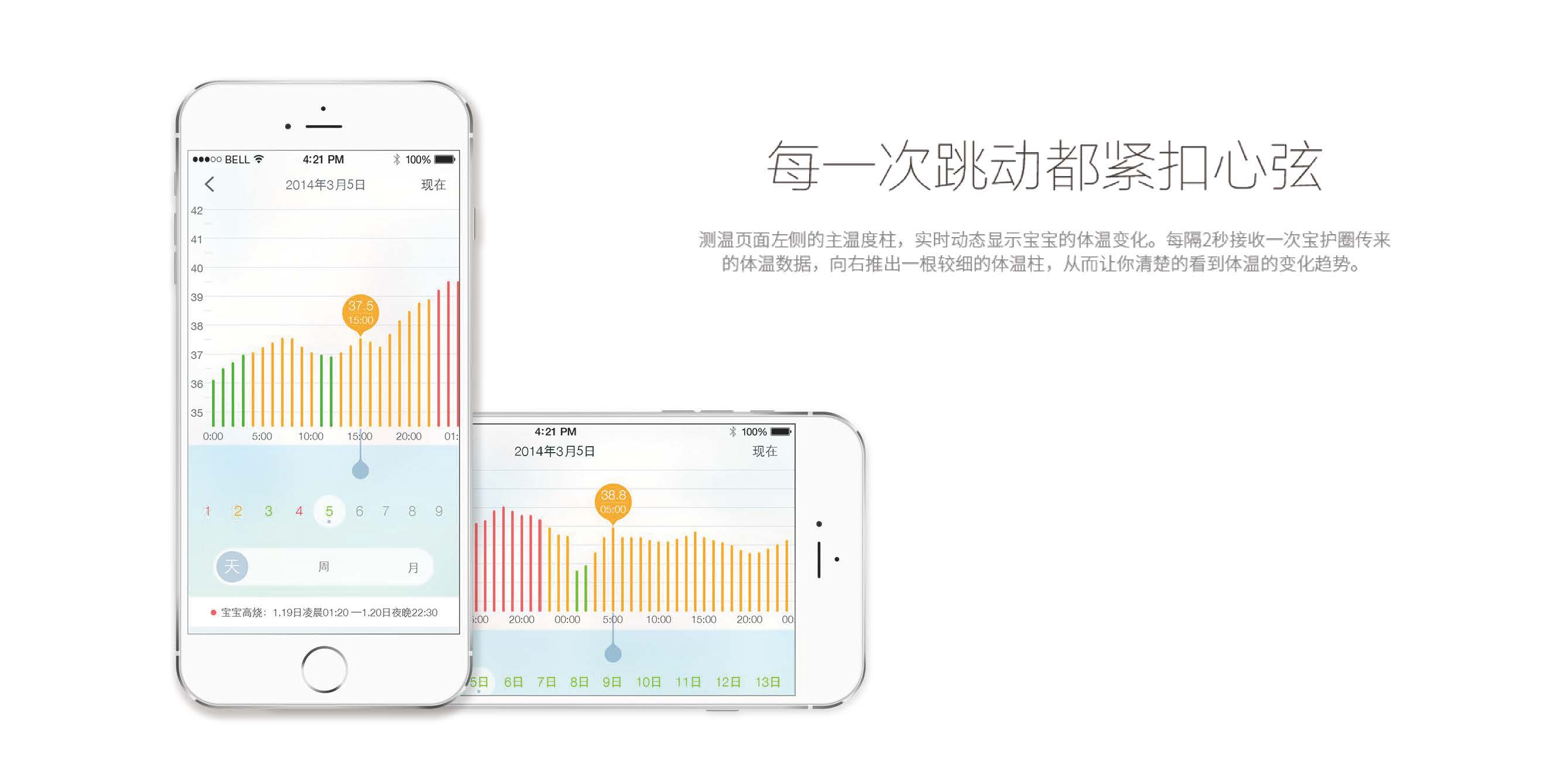 “寶護(hù)圈”整體設(shè)計(jì)親切溫和,最優(yōu)美的線條也是最溫潤(rùn)亮澤的形態(tài),柔韌體貼的護(hù)圈設(shè)計(jì),超乎想象的柔軟質(zhì)感,順滑細(xì)微,呵護(hù)寶寶的嬌嫩肌膚。同時(shí)可連接APP,登錄統(tǒng)一賬號(hào),即使遠(yuǎn)在異國(guó)他鄉(xiāng),也能即使獲知寶寶體溫變化情況,為愛(ài)而生,讓寶寶得到更好的呵護(hù),媽媽更安心。