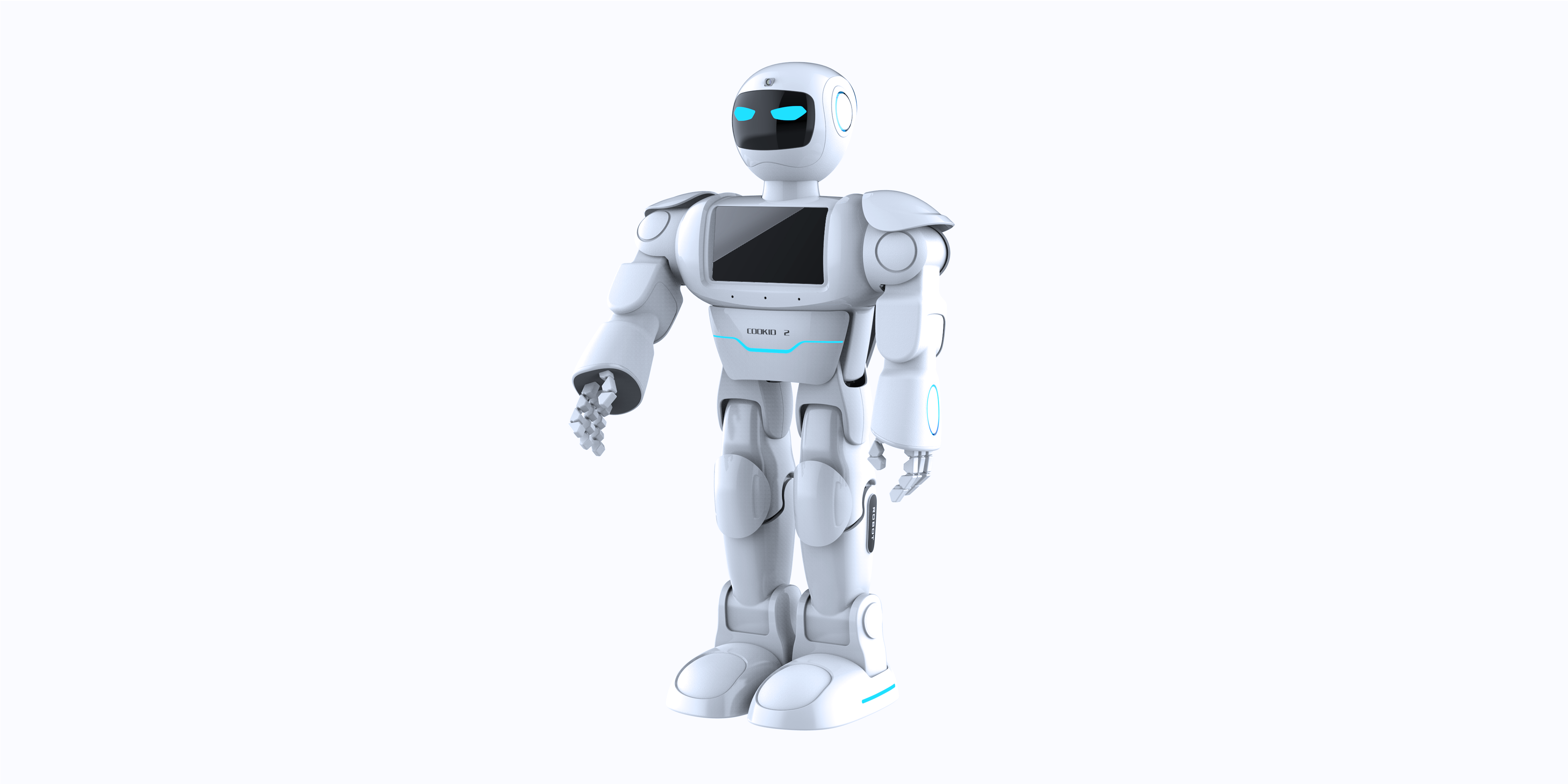 全關節機器人簡約、富有現代科技的設計風格 以簡潔明了的白色為主,配以黑色為輔,形成鮮明的相對比,并通過藍色的燈點加以點綴,凸顯產品的科技感,整體產品的線條又凸顯了產品的牢固性,充分表達了產品所應具備的特點。