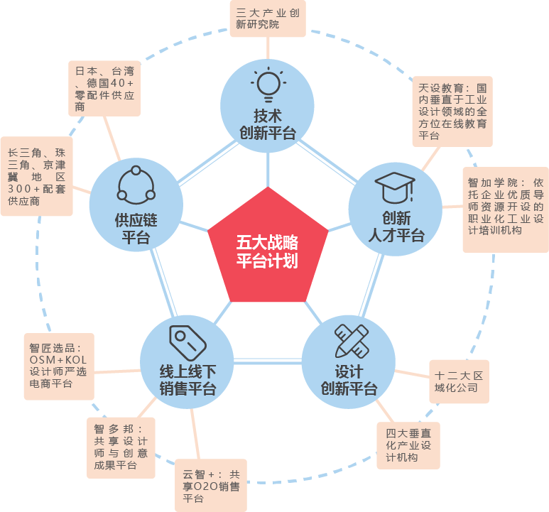 圍繞著智加對于工業(yè)設(shè)計與產(chǎn)業(yè)高度結(jié)合的生態(tài)系統(tǒng)營造,智加多年來始終深度布局來構(gòu)建五大戰(zhàn)略生態(tài)平臺,這個計劃關(guān)聯(lián)著產(chǎn)業(yè)上下游多維度資源的整合,同時智加構(gòu)建戰(zhàn)略生態(tài)平臺目標是實現(xiàn)行業(yè)領(lǐng)域真正的開放共融,讓設(shè)計無邊界化